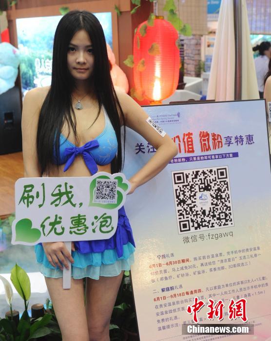 5月19日,正在福州举行的第十六届海峡两岸经贸交易会上,性感女模特在海峡两岸旅游文化用品展区内亮“雷人”广告,为一温泉旅游项目商家促销。中新社发刘可耕 摄