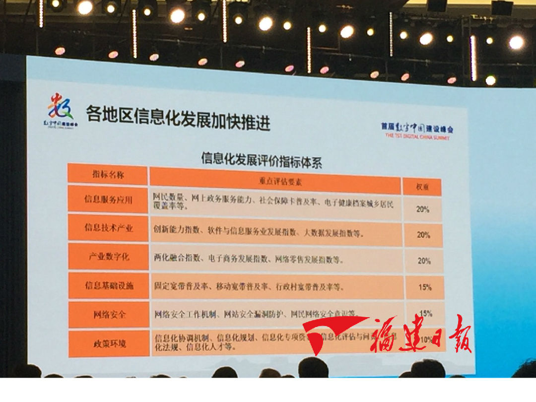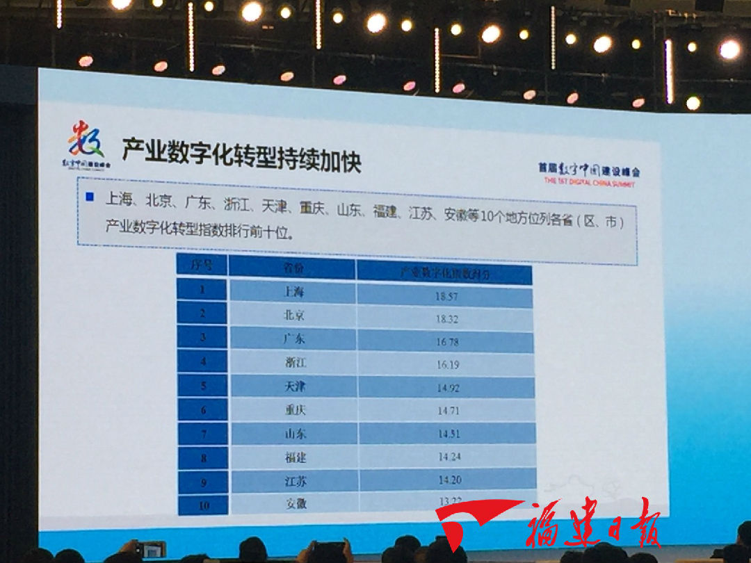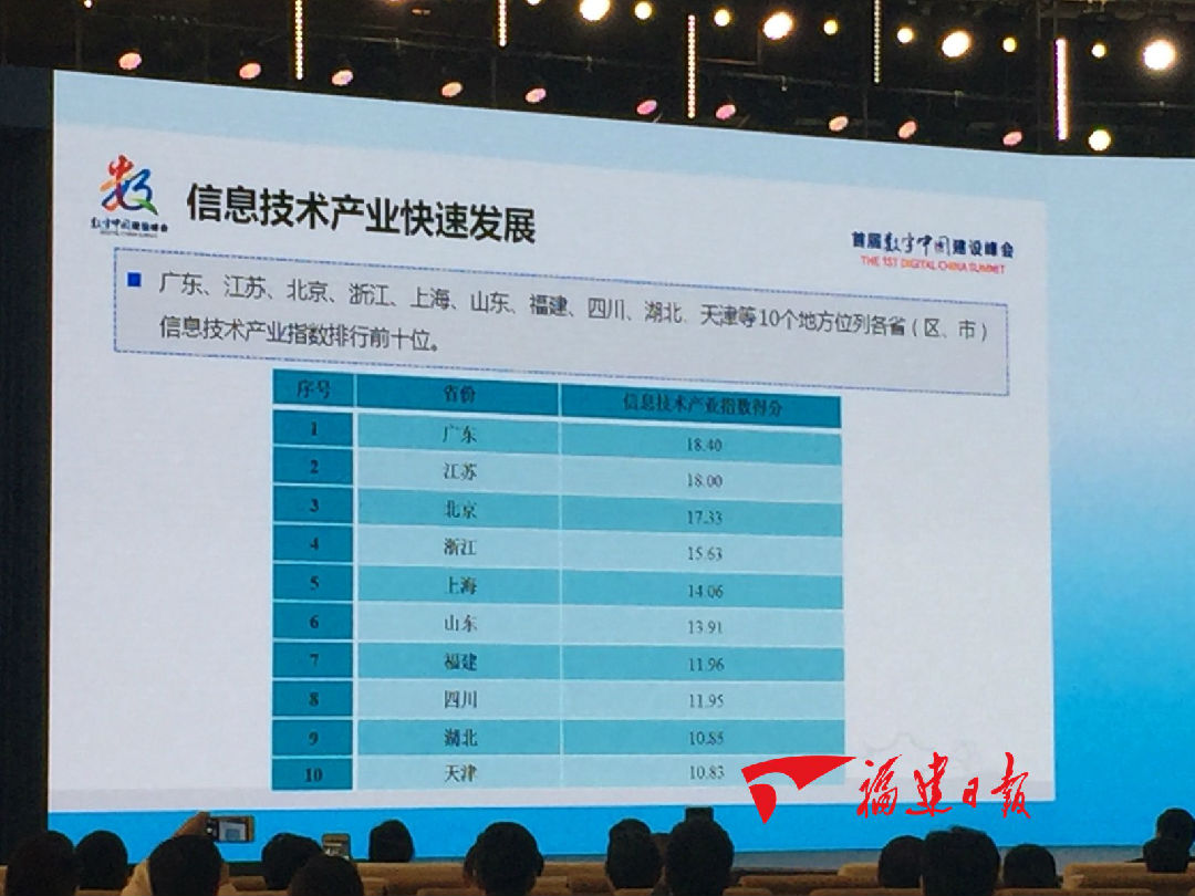 东南网4月22日讯(福建日报APP—新福建记者 郑璜 林侃)在22日上午举行的首届数字中国建设峰会主论坛上,国家互联网信息办公室副主任杨小伟发布了《数字中国建设发展报告(2017年)》。去年,全国各地区信息化加快推进,在信息化发展评价指标体系中,福建表现抢眼,信息化发展水平位居全国第六位,信息服务应用惠及全民方面更是位居第一。此外,信息技术产业快速发展、产业数字化转型持续加快和信息基础设施能力全面提升方面,福建分别位居全国第七、第八、第六位。 |