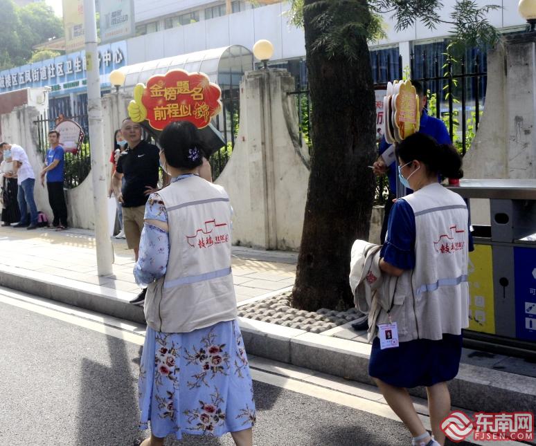 考场外,社区工作人员举着金榜题名的标语鼓励考生。东南网记者 林先昌 摄