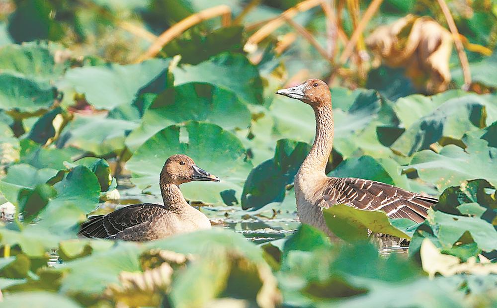 豆雁在晋江九十九溪觅食。黄宝桐 摄 东南网11月9日讯(福建日报记者 王敏霞) 日前,晋江市九十九溪池店段一片莲花池中发现了7只豆雁。这群豆雁大小和形状与家鹅相似,在水里悠闲地觅食。这是晋江首次发现豆雁,刷新了当地鸟类物种纪录。 豆雁是“三有”保护鸟类,被列入中国国家林业和草原局发布的《国家保护的有益的或者有重要经济、科学研究价值的陆生野生动物名录》。豆雁一般繁殖于俄罗斯西西伯利亚至贝加尔湖的泰加林和树木繁茂的苔原带;越冬在日本、朝鲜和我国长江中下游及东南沿海地带,罕见于海南、台湾、香港;迁徙季节途经我国华北和东北等地。作为冬候鸟,豆雁通常每年8月至9月离开繁殖地,10月至11月飞临我国越冬。迁徙期间和冬季主要栖息于沼泽、湖泊、沿海海岸和农田地区,在闽南比较罕见。 据泉州市观鸟学会会长吴轲朝介绍,豆雁在迁徙途中停留晋江,得益于晋江持续改善生态环境、不断加强对农田和湿地的保护,为鸟类提供了良好的栖息环境和充足的食物来源,使当地成为候鸟迁徙途中的“中转站”和“加油站”。 |