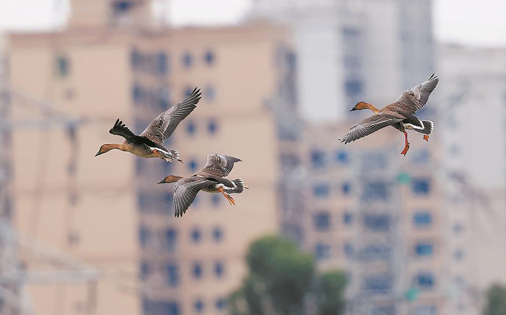 豆雁在晋江上空飞翔。郑榕凯 摄