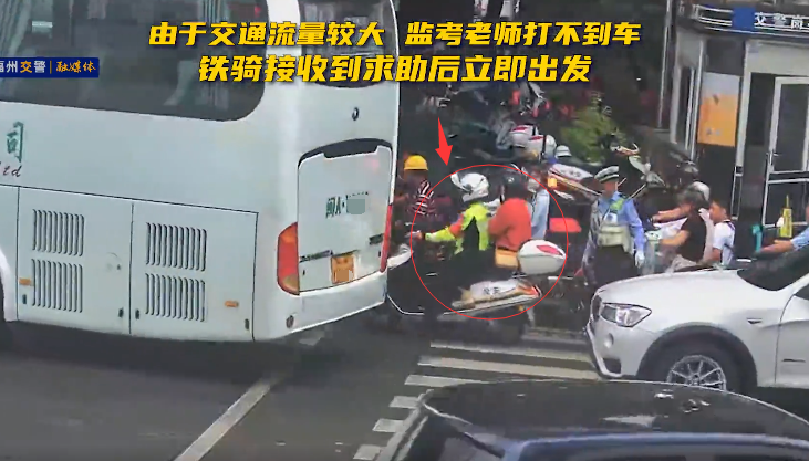 6月7日上午7点52分,福州交警接到一名监考老师求助,因车流量大打不到车,请求铁骑护送至考点学校。交警护考小分队接到求助后立即出发,仅用3分钟就将监考老师顺利送达地点。(图片来源:福州交警微发布视频截图)