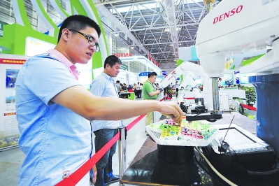 “并联式机械手”飞快、灵活地摆弄着10多枚大号的骰子,一会儿按颜色不同分类,一会儿摆成整齐的队列,一会儿又一层层码起来……其精准程度,丝毫不亚于人手。泉州微柏工业机器人有限公司带来的这台机器人,令人啧啧称奇。
