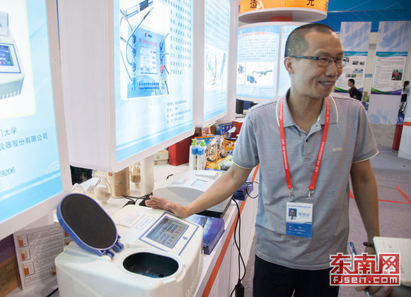 在福建工业馆,日冠针纺织机械有限公司带来全球首创的双面冷染直印机。“在常温下就可实现双面同时印染,按一天工作8小时、染布2万米计算,所需人工可从20个减少到3个。”董事长纪荣康说,由于用类似于印刷的技术取代了传统的染整工艺,配合自主研发的环保染料,不仅染料利用率达97%,节约了大量水、煤资源,还实现废水的清洁排放,其中6项指标达到直排标准。