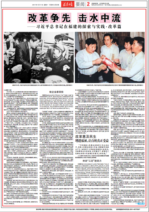 福建日报长篇通讯《改革争先 击水中流》在我省广大干部群众中引起热烈反响 东南网7月18日讯(福建日报记者)昨日,福建日报刊发长篇通讯《改革争先 击水中流——习近平总书记在福建的探索与实践·改革篇》,省内外媒体第一时间纷纷转载,在我省广大干部群众中引起热烈反响。大家表示,习总书记在推进改革的过程中,敢啃“硬骨头”,敢于涉险滩,体现了他情系福建、心系百姓的为民情怀,勇于担当、先行先试的改革精神。当前,抓好改革是一项政治任务,也是一个时代命题,我们要从总书记始终重视改革、大力推动改革中汲取力量,继续推进社会各领域的改革创新,不断革除体制机制弊端,为再上新台阶、建设新福建作出更大贡献。 探索国有企业股份制改革、总结“晋江经验”、推动审批制度改革、谋划林权制度改革……报道用一个个精彩的改革故事,展现了习近平总书记在福建工作期间亲力亲为推进各项改革的探索与实践。昨日一早,许多干部群众通过福建日报、福建日报社(报业集团)所属网站、《新福建》客户端、福建日报微信微博等,细细阅读《改革争先 击水中流》,不少人纷纷转发,推荐给亲朋好友。 解放和发展生产力,就要进一步推进经济体制改革。我省干部群众表示,当年习近平总书记在福建倡导并推动国企改革,总结“晋江经验”,至今仍是福建加快发展的一笔宝贵精神财富。 “习近平同志在福建工作期间高度重视改革工作,亲力亲为、勇于担当、不畏困难,直面发展过程中的挑战,以改革为突破口精准发力,促进各项事业持续健康发展,为我省发展注入澎湃动力。”省发改委有关负责人表示,要深入贯彻习近平总书记系列重要讲话精神和治国理政新理念新思想新战略,真抓实干促改革,全心全意谋发展,以供给侧结构性改革为主线持续深化经济体制改革,进一步推动投资审批“放管服”改革,带动福建经济社会稳步发展,为建设机制活、产业优、百姓富、生态美的新福建贡献力量,以优异成绩迎接党的十九大胜利召开。 省经信委有关负责人表示,习近平总书记在闽工作期间,曾多次对经贸工作作出重要指示,为推动全省经信发展提供了宝贵精神财富和工作指南。下一步,全省经信系统将坚持以“创新、协调、绿色、开放、共享”五大发展理念为引领,以建设先进制造业大省为目标,以深化“三去一降一补”供给侧结构性改革为主线,以提高发展质量和效益为中心,以推进产业优为重点,加快推动新旧发展动能转换,促进工业保持中高速增长、产业迈向中高端。 省国资委党委书记刘捷明说,读完报道,激动的心情难以平静。2014年,他是向总书记写信的我省30位企业家当中的一员,对总书记在回信中再次对福建企业家给予的肯定和勉励,至今仍深受鼓舞。他表示,党的十八大以来,习总书记一以贯之地重视国有企业深化改革和健康发展,多次作出重要论述。当前,省国资委正通过稳妥推进一批企业混合所有制改革、推进完善企业法人治理结构、推进经营性国有资产集中统一监管、推进“瘦身健体、提质增效”等举措,大力支持和鼓励企业家创新创业,力争在国有企业改革重要领域和关键环节取得决定性成果,促进产业转型升级,促进国有企业做强做优做大。 习近平总书记当年先行先试,推动福州外经“一栋楼”建设,大力推进审批制度改革,倡导与企业家建立“君子之交”,这篇报道中的生动叙述,让干部群众读后印象深刻。 福州市社保中心主任刘登祥说,老百姓所关心所期盼的,就是改革的方向和目标。为让群众办事“多走网路,少跑马路”,福州市社保中心去年底创新“互联网+社保服务”模式,启用社保参保可信电子证明平台系统,在全国率先告别打印社保证明,并在此基础上推出社保缴费随手查APP,已惠及外来务工人员近1万人次。“我们将进一步深化创新便民服务,让‘社保缴费随手查’覆盖所有参保群众。” 尤溪县行政服务中心副主任陈秀花说,习近平总书记当年倡导设立的“一栋楼”,如今早已发展成为遍布全省的行政服务中心,他提出的“马上就办”精神,在八闽大地深化践行。“作为行政服务中心的一名普通干部,我们要扎实服务好基层办事群众,把‘马上就办’精神落实在审批真正简化、服务更加到位、环境明显改善上。” 习近平总书记在推进改革的过程中,始终把人民群众的利益摆在至高无上的地位,让改革成果惠及民生、受益百姓,为民情怀感人至深。广大干部群众认为,当前全面推进深化改革,正是要让百姓有更多的获得感。 “早在2001年,习近平同志就在福建创造性地倡导并大力推动治理‘餐桌污染’、建设‘食品放心工程’。近年来,他更是多次强调,要用最严谨的标准、最严格的监管、最严厉的处罚、最严肃的问责,确保广大人民群众‘舌尖上的安全’。”省食品药品监督管理局局长林凤祥表示,全省食药监系统要时刻紧绷食品安全这根弦,通过严守安全底线、严控风险隐患、严格日常监管等举措,不断提升食品药品安全治理能力和服务产业发展水平,以实实在在的监管成果,确保广大人民群众吃得放心。 省林业厅林业改革处处长徐文辉表示,习近平总书记当年亲自主导开展集体林权制度改革,指明了林改的方向和道路。“15年来的林改实践,让广大林农从林业发展中受益,实现了资源增长、林农增收、生态良好、社会和谐的目标。