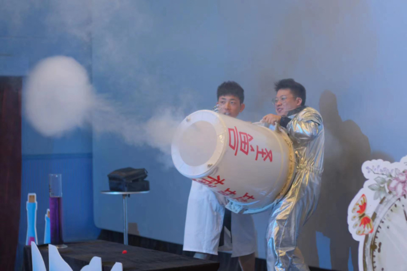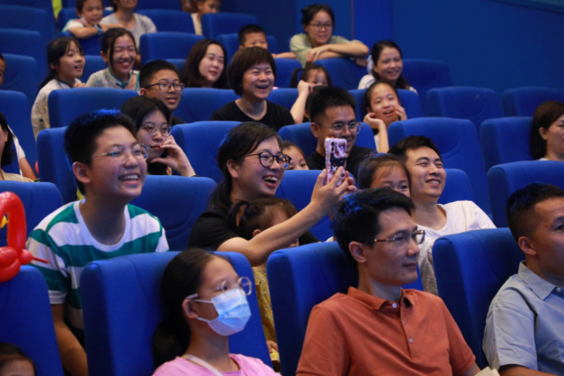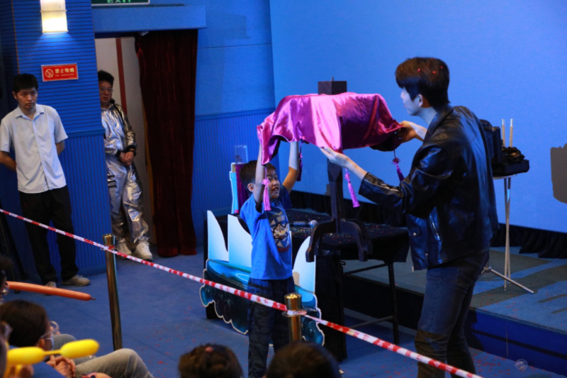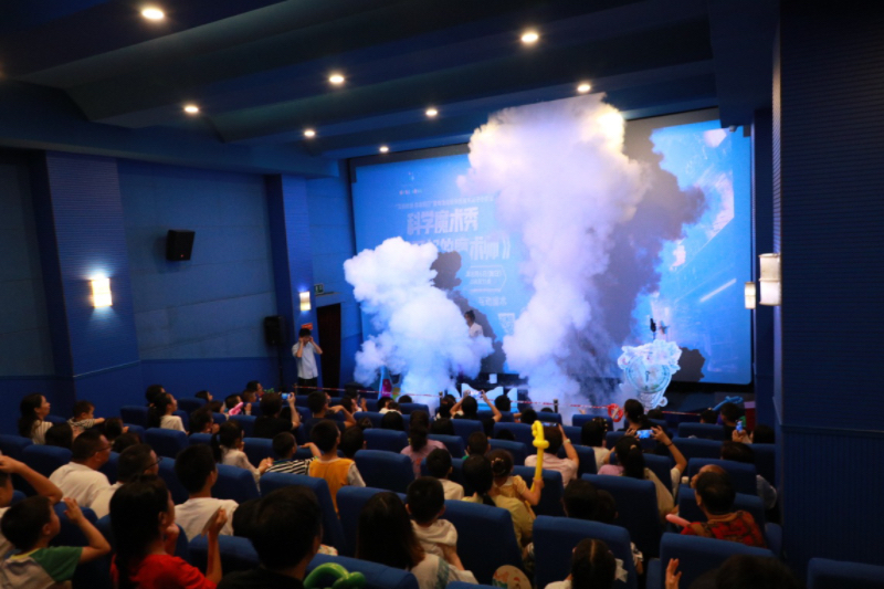 暑期正值旅游热潮,演出开始前,杂技团志愿者们向到场的观众发放文明旅游宣传手册及小礼品,宣传文明旅游重要性。活动开始,魔术表演演员首先带来传统手彩、餐桌悬浮等传统近景魔术,随着演出深入,魔术师们秀出的绝活一个赛一个“厉害”,还有来自未来的“时空穿梭者”为大家上演“空气炮弹” “干冰大爆炸” “激光枪” “神奇的液体”等刺激又逗趣的科学实验,并邀请现场观众一起参与,近距离感受科学融入魔术的魅力。