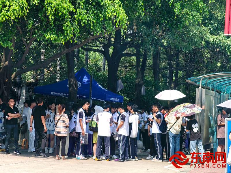 福清元洪高级中学考点,考生正等候进入考场。(东南网福清频道记者俞雅萍 摄)