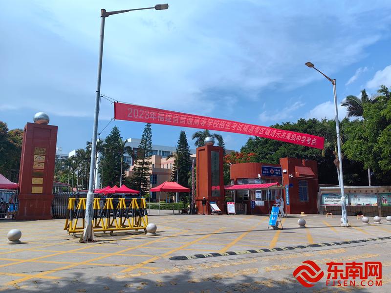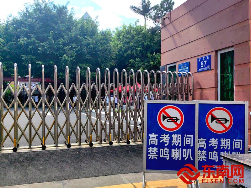 福清第一中学考点,校门口已经摆好高考禁鸣标识。(东南网福清频道记者俞雅萍 摄)