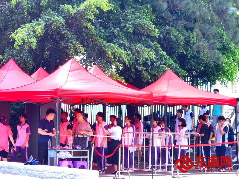 福清华侨中学考点,校门口帐篷搭建的遮阳通道,为考生提供夏日清凉。(东南网福清频道记者黄盛青 摄)