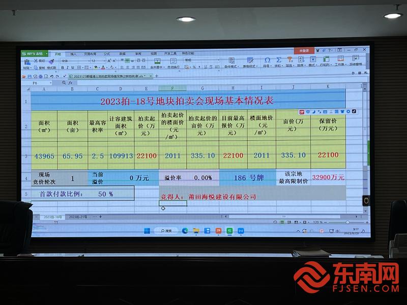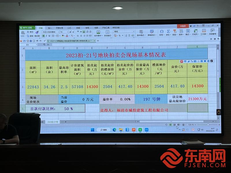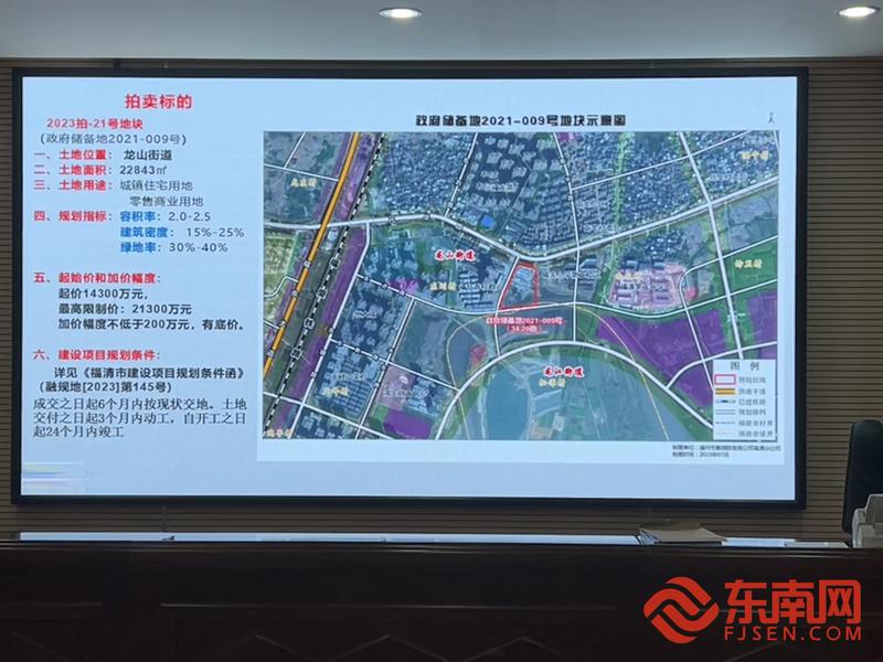 宗地2023拍-21号地块位于龙山街道,为住宅用地一城镇住宅用地、商服用地一零售商业用地;土地面积为22843㎡,容积率为2.0-2.5;拍卖起价为人民币1.43亿元,加价幅度不低于200万元,最高限制价为2.13亿元。此块宗地由福清市城投建筑工程有限公司以底价1.43亿元顺利拿下,成交楼面价约2504元/㎡,成交亩价为417.4万元/亩,溢价率为0%。
