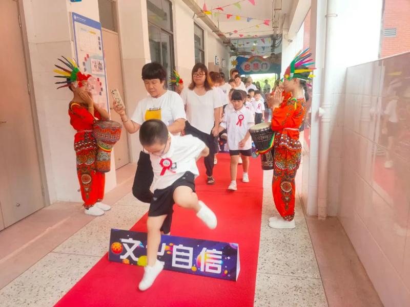 新生和家长们踏上红毯,穿越启慧之门,跨越“五自格言”。(图源 福清元载小学)