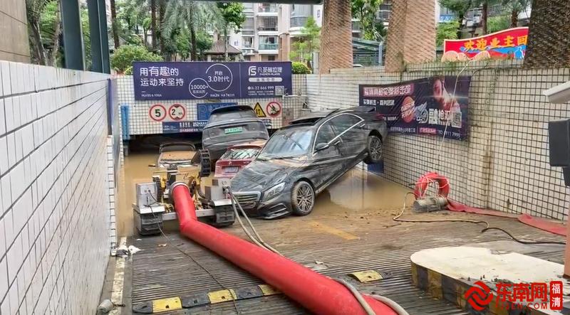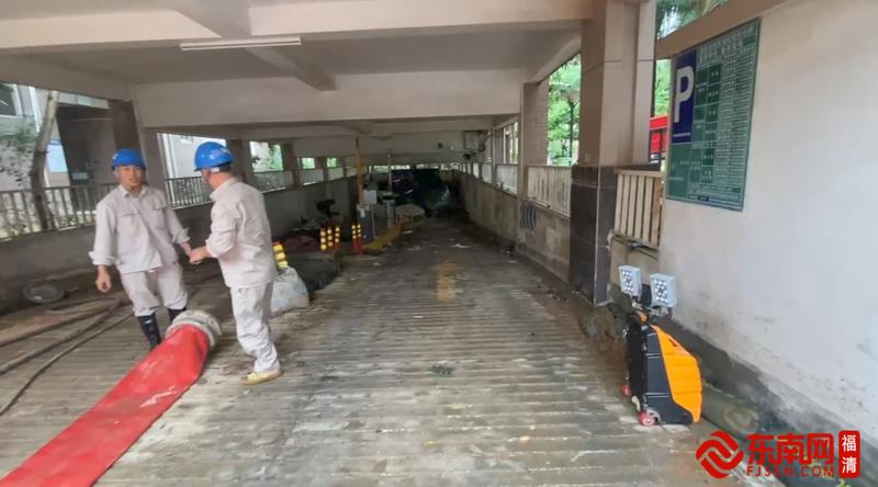 锦绣家园小区地下停车场积水抽取中(东南网福清频道记者 黎臻懋 摄)