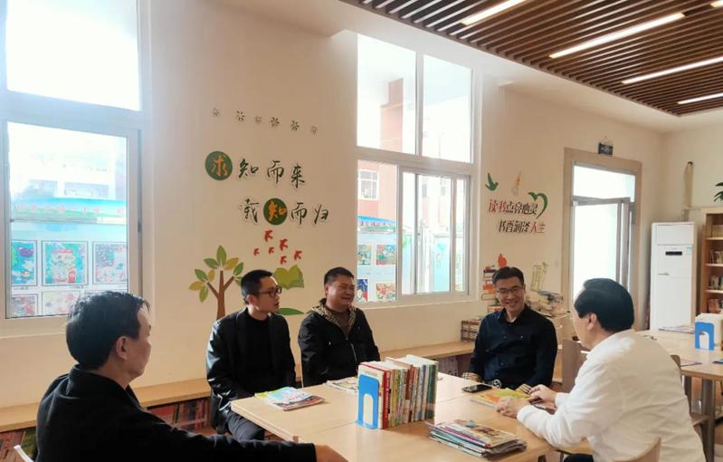 高山村乡贤薛广祥(右一)、王可兴(右三)等到高山中心小学商讨奖教奖学基金捐款事宜。 (福清市委组织部供图)