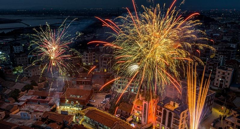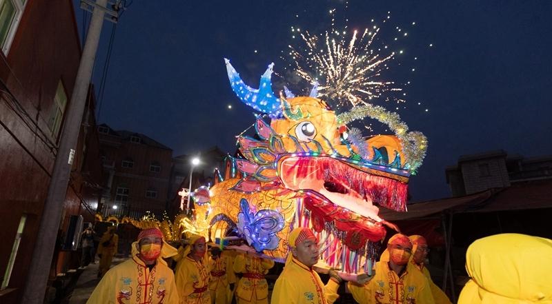15日晚,完成祭祀仪式后,板凳龙的龙头、龙尾与村民们制作的龙身连接。紧接着,板凳龙上的灯光亮起,260多名青壮年扛着这条巨龙开始游舞,穿梭在村头巷尾,时而“蛟龙出海”,时而“穿花嬉戏”,不断腾挪闪转,将美好的祝福送给千家万户。