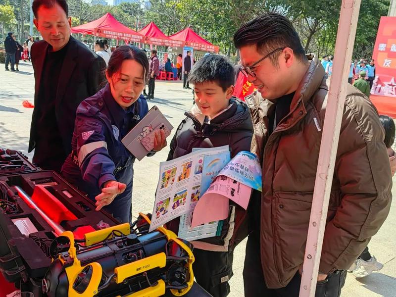 福清市蓝天救援中心队员现场为群众展示水下机器人和水下声纳设备并现场教授心肺复苏急救操作要领。
