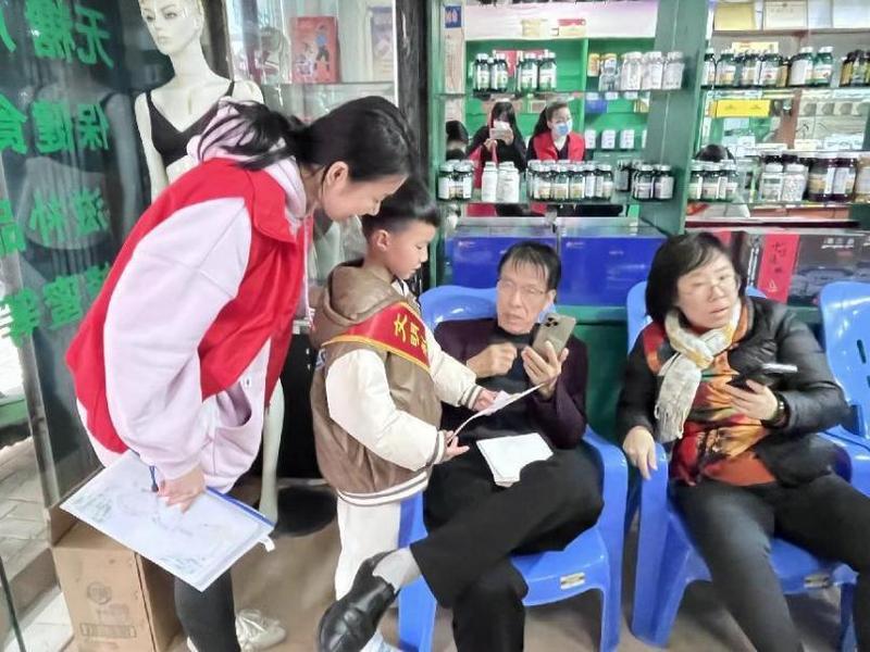 志愿者们带着孩子们走进社区,向街坊邻居和周边商户宣传交通安全和消防安全。