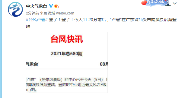 今天上午11:20前后,今年第9号台风“卢碧”登陆广东省汕头市南澳县沿海。