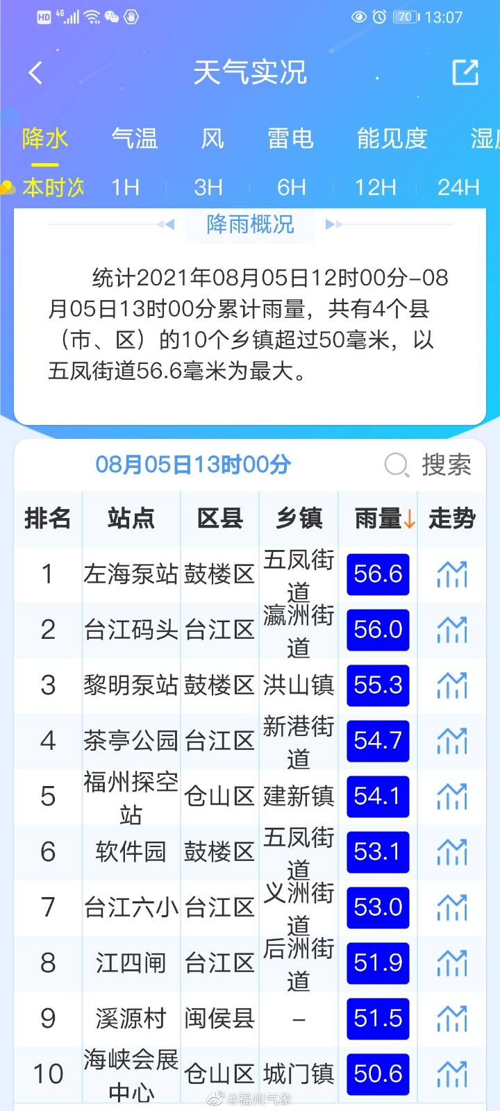 红色预警!福州暴雨!多地近1小时雨量超过50毫米