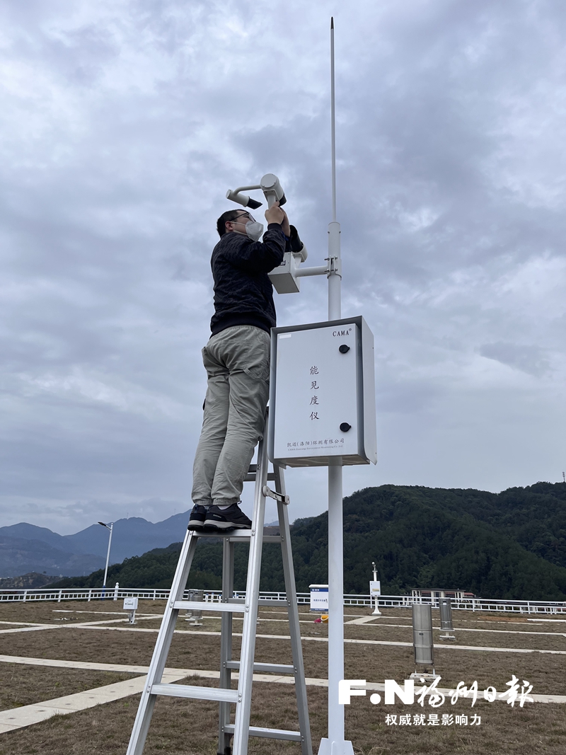 李青松在维护能见度仪。(闽清气象站供图)