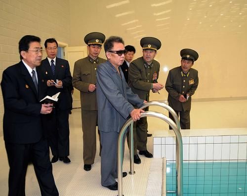 朝鲜中央通讯社3月20日公布了朝鲜最高领导人金正日在平壤金日成综合大学新建成的游泳馆视察的照片。韩国媒体将这几张照片与金正日今年1月会见中共中央对外联络部部长王家瑞时的照片比较后,发现金正日腹部明显变小,完全瘦了一圈。
