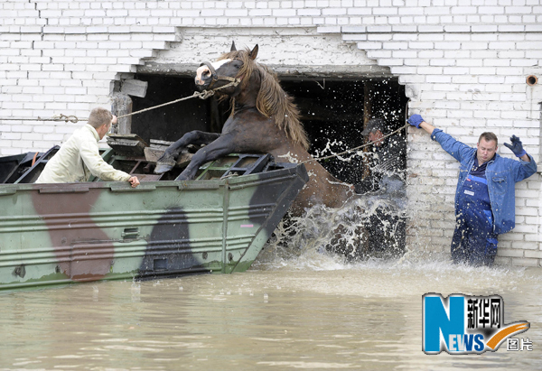 5月24日,灾民在波兰中部一座被洪水围困的村庄转移马匹。上周持续强降雨造成波兰主要河流维斯瓦河和奥得河出现险情。据波兰媒体报道,截至24日,洪灾已造成15人死亡,数万人被迫转移。此次水灾范围几乎遍及波兰全境,多处公路、铁路被毁,交通中断。新华社/法新