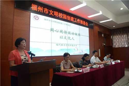 ▲ 市委教育工委专职副书记黄坚瑜讲话 图片由福州教育学院附属中学提供 近段时间以来,全市教育系统服务中心、围绕大局,坚持问题导向和结果导向相结合,分类指导和典型指导相结合,深入推进“有福之州·文明同行”行动,不断提升未成年人思想道德建设和系统文明城市创建水平,文明校园创建工作取得了阶段性成绩。接下来,系统创建工作将如何持续深入开展?当天的推进会就此作了再动员、再部署。 会议强调,要紧扣新中国成立70周年主题推进精神文明建设。要坚持高标准、高要求、高格调、高质量,按照各级通知要求,充分尊重发挥广大基层干部师生的积极性、创造性。按照中央、省、市通知要求,全市教育系统区分“领悟、颂扬、献礼、奋进”四个篇章,广泛开展庆祝新中国成立70周年主题宣传教育系列活动。各地各校积极筹划,主动作为,营造出热烈、向上的政治氛围。接下来,大中小学思政课中要开设庆祝新中国成立70周年教学专题。全日制学校在国庆长假期间要悬挂国旗,各学校要利用校园公共区域开展爱国主义主题宣传。 会议要求,要把思想道德建设贯穿创建工作全过程。创建文明校园包含了领导班子建设好、思想道德教育好、活动阵地好、教师队伍好、校园文化好和园环境好等“六个好”的标准。其中,思想道德建设起到了至关重要的作用。学校领导班子在文明创建过程中,要着重抓好学生的思想道德教育,在校园中形成文明的风气,使文明建设成为所有师生的自觉行为,全校协同,师生齐心,共同为推动校园文明建设、培养德智体美劳全面发展的社会主义建设者和接班人不懈奋斗。 会议指出,要狠抓文明城市建设各项任务落实。要把高质量完成届中复查作为硬任务硬指标,加强实地考察暗访,整改薄弱环节,突出自身特色,网上材料申报要做到对表对标、精准作答;要把抓好未成年人思想道德建设作为责任田,严格对标,在市委文明办指导下,承担起未成年人思想道德建设落地落实任务;要把“有福之州 文明同行”活动作为常态任务。严格按照市里关于主题教育、垃圾分类、信用体系建设等部署要求,结合教育工作特点和实际,滴水穿石,久久为功,为省会创建全国文明城市不断作出新的更大的贡献。 当天的会议还就教育系统下一步的安全稳定和近期防抗台风工作作了重要部署。 近年来,福州教育学院附属中学坚持立德树人,将文明创建工作落实到各个方面,并取得了良好成效,获评全国国防教育特色示范校、福建省第一届文明校园等荣誉。 推进会上,该校校长曾淑煌以《用心用情用功做实以文化人》为题,从精心打造立德树人的“楼”文化、精致打造崇德修身的“园”文化、精巧打造五育并举的“廊”文化和精细打造向上向善的“班”文化等四个方面,介绍了学校的文明校园创建经验和特色做法。
