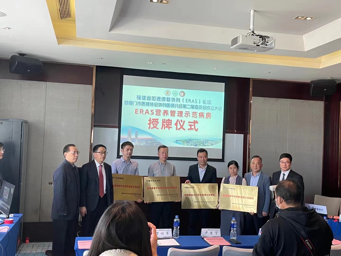 加速康复外科(ERAS)理念近年来已逐渐成熟,在多学科领域取得了重要成果,临床营养已从单一疾病支持治疗走向以预防筛查、治疗、康复和人文关怀的全方位多系统的整合营养学模式。叶启文介绍说道,ERAS是近年来外科领域新的理念和治疗模式,它的重要性与日俱增,其中“营养”已经成为ERAS核心措施之一,临床营养在胃肠外科重要性尤为凸显。此次授牌,是对我们以前工作的肯定,也是对我们以后工作的激励。营养标准化病房的建立,对临床营养重要性的认识进一步提升,同时也有利于推动宁德市临床营养治疗更加科学化、标准化和专业化。