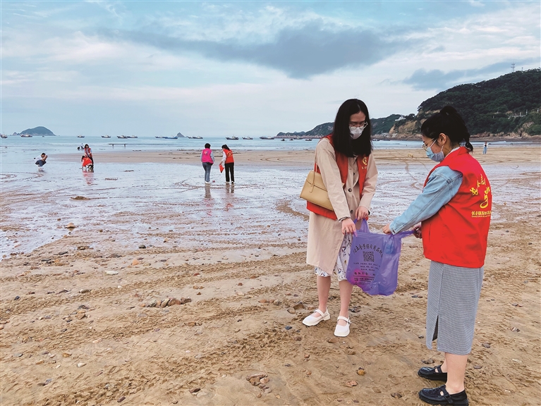 为庆祝中国共产主义青年团成立100周年,5月6日,霞浦县长春镇团委来到高罗沙滩开展五四青年节主题团日活动。在高罗沙滩,志愿者们对沙滩上的垃圾进行清理,并向过往游客宣传环境保护和疫情防控知识,进一步提升海滩环境质量。(闽东日报 阮清音 摄)