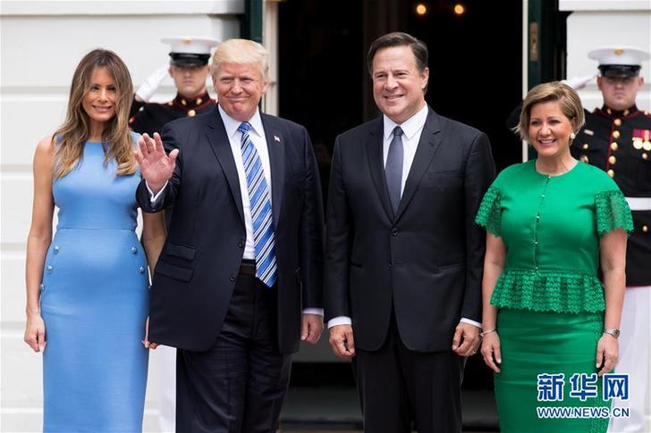 6月19日,在美国华盛顿白宫,美国总统特朗普(左二)和夫人梅拉尼娅(左一)欢迎到访的巴拿马总统巴雷拉(右二)和夫人洛雷娜·卡斯蒂略。当日,美国总统特朗普在华盛顿白宫会见巴拿马总统巴雷拉。新华社发(沈霆摄) |