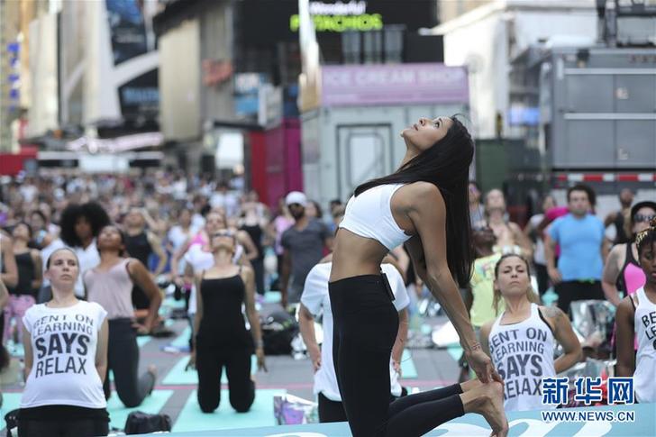 6月21日,在美国纽约,一名教练带领瑜伽爱好者在时报广场做瑜伽。当天,数千名瑜伽爱好者在纽约时报广场参加大型瑜伽免费教学活动,迎接夏至的到来。新华社记者 王迎 摄 |