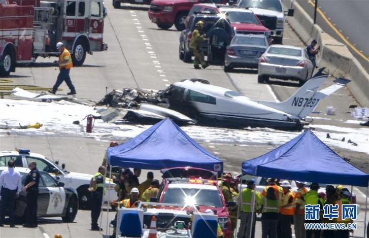 这是6月30日在美国加利福尼亚州奥兰治县拍摄的坠机现场。一架小型飞机30日在美国加州一机场附近高速公路上迫降失败、爆炸起火,造成至少3人受伤。新华社发(赵汉荣摄) |