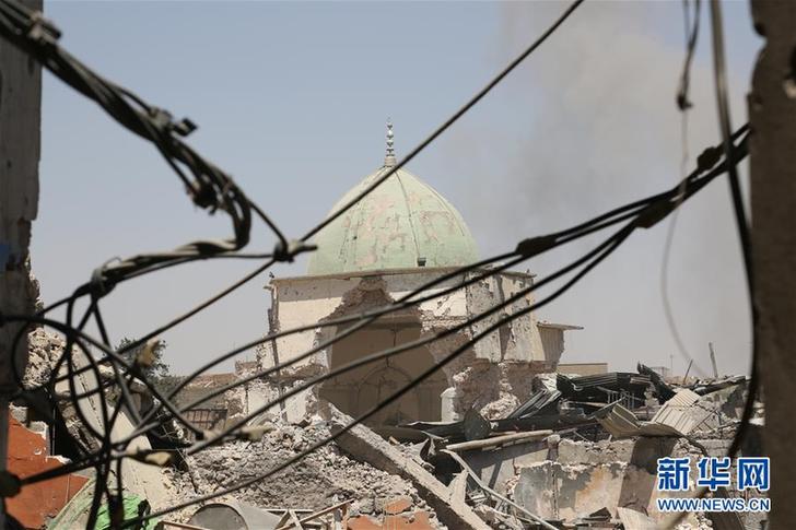 这是6月29日在摩苏尔老城努里清真寺旁边的街道上拍摄的寺内一座受损穹顶建筑。伊拉克军方29日宣布,政府军当天上午收复了摩苏尔努里清真寺所在的地区。新华社记者程帅朋 摄 |