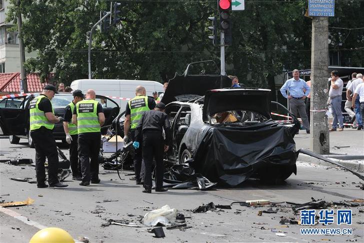 6月27日,在乌克兰首都基辅,调查人员勘查轿车爆炸现场。乌克兰国防部27日发布消息说,乌首都基辅当天上午发生一起轿车爆炸事件。驾驶轿车的乌国防部侦察总局现役上校军官马克西姆·沙波瓦尔在爆炸中当场死亡,车上没有其他乘客。新华社记者陈俊锋 摄 |