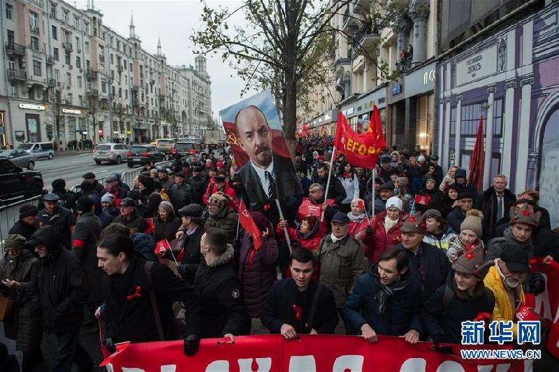 11月7日,在俄罗斯莫斯科,人们参加纪念十月革命100周年游行活动。 2017年11月7日是俄国十月革命胜利100周年纪念日。十月革命的发生地——俄罗斯在这一天组织了多场社会活动,纪念这一开创人类历史新纪元的重要日子。 |