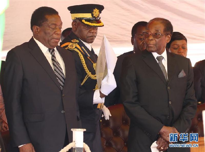 津巴布韦众议院议长雅各布·穆登达11月22日中午宣布,执政党津巴布韦非洲民族联盟-爱国阵线(民盟)决定推选该党主席兼第一书记埃默森·姆南加古瓦为新任总统,接替21日辞职的前总统罗伯特·穆加贝。宣誓就职仪式将于24日在首都哈拉雷举行。 这是11月1日在津巴布韦首都哈拉雷拍摄的穆加贝(前右)和姆南加古瓦(前左)出席活动的资料照片。新华社发(费列蒙摄) |