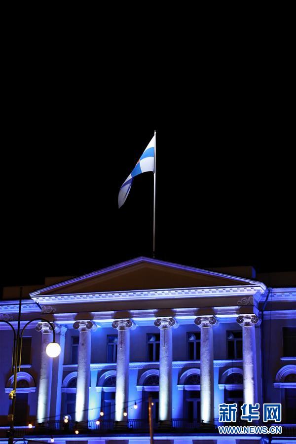 12月6日,芬兰首都赫尔辛基大学主教学楼顶飘扬着芬兰国旗。6日,芬兰迎来独立100周年纪念日,首都赫尔辛基的主要地标建筑都被象征国旗颜色的蓝白彩灯照亮。新华社记者李骥志 摄 |