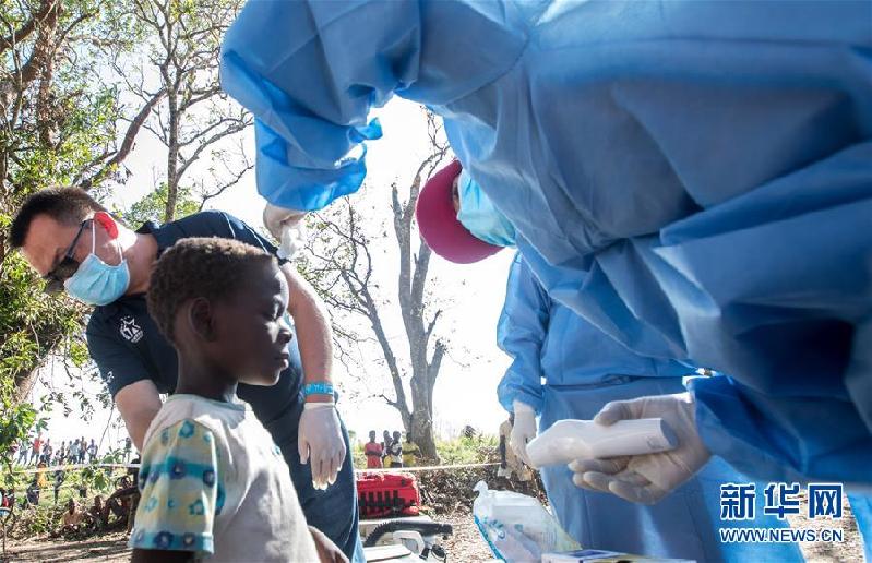 3月27日,在莫桑比克贝拉市远郊的一处安置点,中国救援队医护人员为一名儿童测量体温。赴莫桑比克实施国际救援的中国救援队27日至28日在受强热带气旋“伊代”重创的莫中部索法拉省展开救助行动。两天来,中国救援队先后派出三支分队,前往索法拉省省会贝拉市区、远郊灾民安置点以及布济河流域展开救助行动。新华社记者张宇摄 |