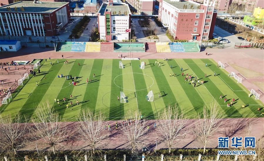 12月5日,学生们在比赛中。(无人机拍摄) 当日,河北省大厂回族自治县城区二小每学期一届的校园班级足球联赛继续进行。 新华社记者李晓果摄