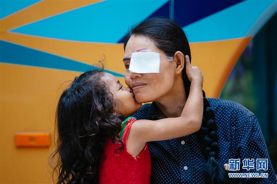 3月15日,在柬埔寨磅湛省医院,孙美乐的女儿亲吻即将做白内障手术的母亲。孙美乐是一位单身母亲。由于经济贫困,她的两个大女儿在金边打工,两个儿子被送进了福利院,只有最小的女儿跟着她生活,母女二人租住在一间简陋的小屋里。新华社记者 朱炜 摄