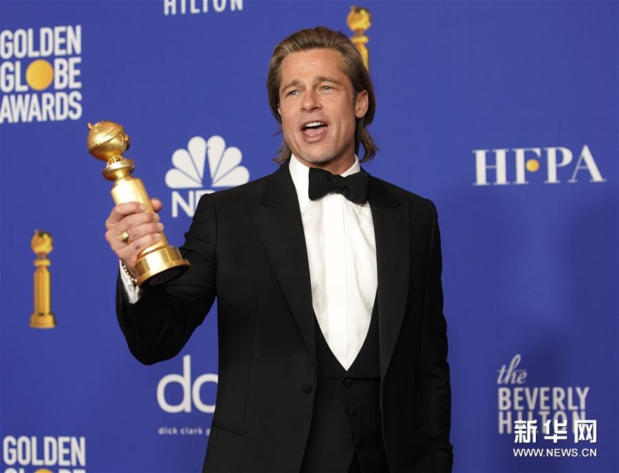 1月5日,在美国洛杉矶,凭借《好莱坞往事》获得最佳男配角的布拉德·皮特与奖杯合影。新华社/美联
