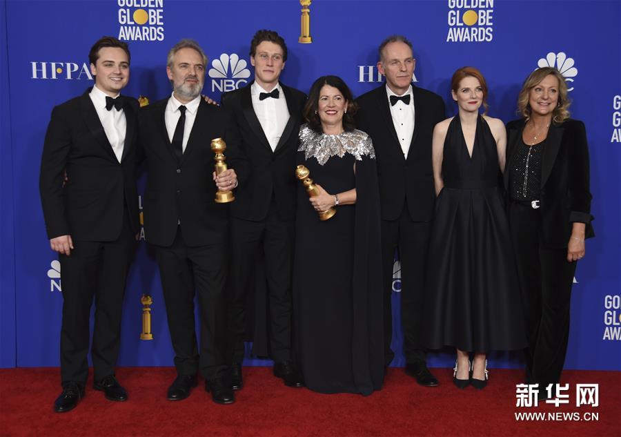 1月5日,在美国洛杉矶,剧情类最佳影片《1917》的主创人员与奖杯合影。新华社/美联