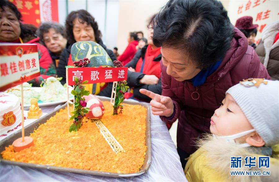1月18日,小朋友在党群活动中心主会场的“万家宴”上观看菜肴。 农历腊月二十四是南方传统“小年”。当日,湖北武汉百步亭社区举办传统“万家宴”活动,社区居民端出自制的一万多道菜品,摆满社区党群活动中心主会场和9个分会场,4万多个家庭欢聚一堂,吃团圆饭、说幸福生活,喜迎新春佳节。 新华社记者 肖艺九 摄