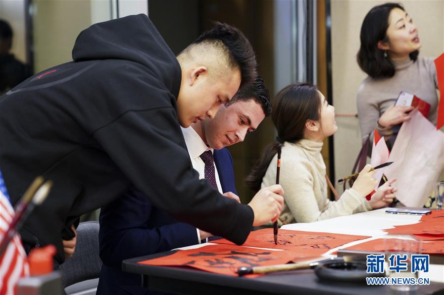 1月19日,在美国纽约举行的中外青年迎新春联欢会上,中外学生体验中国书法。 当天,中国驻纽约总领馆举办中外青年迎新春联欢会。200多名就读于哥伦比亚大学、纽约大学、耶鲁大学等20余所美国高校的中外学生参加此次活动,共庆中国农历新年的到来。 新华社记者 王迎 摄 |