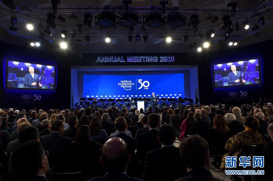 1月20日,在瑞士小镇达沃斯,与会者出席世界经济论坛50周年庆祝活动。 当日,世界经济论坛在瑞士小镇达沃斯举行50周年庆祝活动。