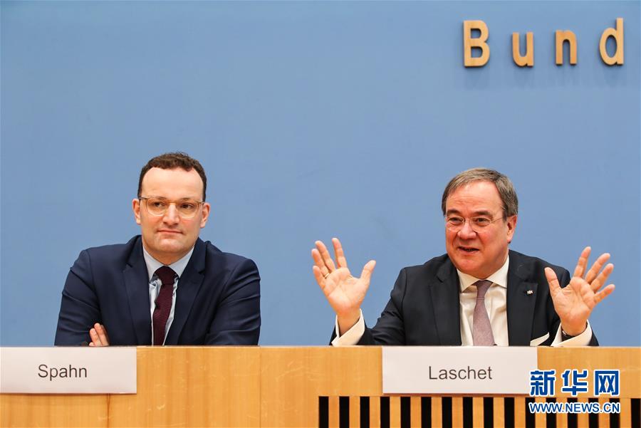 2月25日,在德国首都柏林,德国北莱茵-威斯特法伦州州长阿明·拉舍特(右)与德国卫生部长延斯·施潘出席新闻发布会。 德国执政党基督教民主联盟(基民盟)24日召开党内会议,决定于4月25日举行特别党代会,选举出新任党主席,接替已宣布辞职的安妮格雷特·克兰普-卡伦鲍尔。 新华社记者 单宇琦 摄