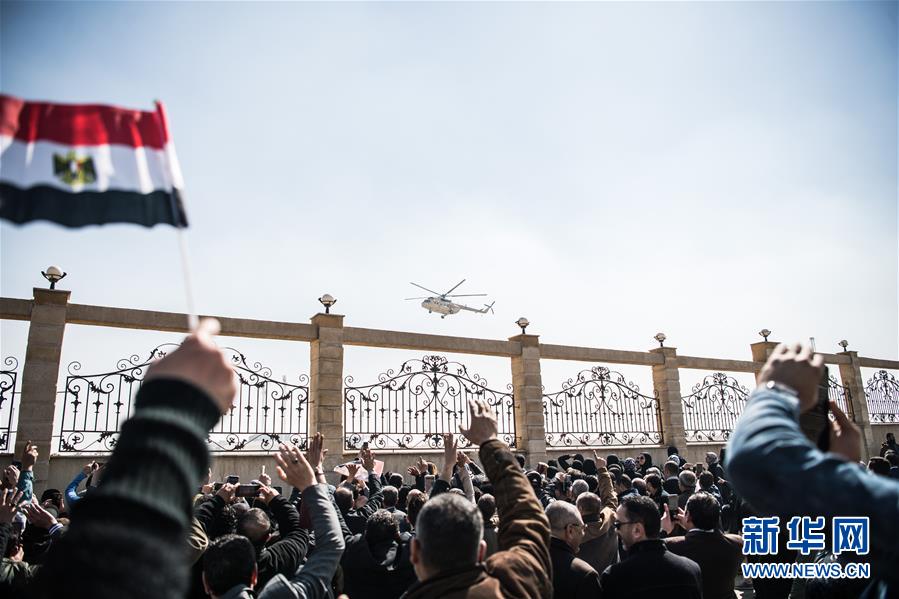 2月26日,在埃及首都开罗,埃及前总统穆巴拉克的支持者向运送棺椁的直升机招手。 埃及前总统穆巴拉克的葬礼26日在埃及首都开罗举行。穆巴拉克25日病逝,终年91岁。 新华社记者 邬惠我 摄