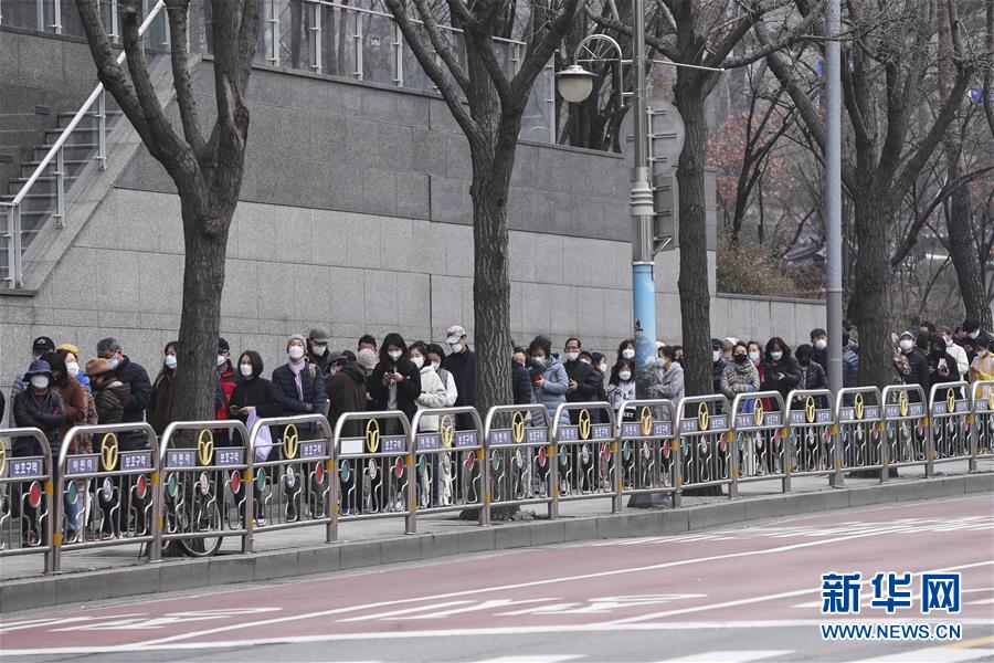 3月1日,在韩国首尔,当地居民在户外排队购买口罩。