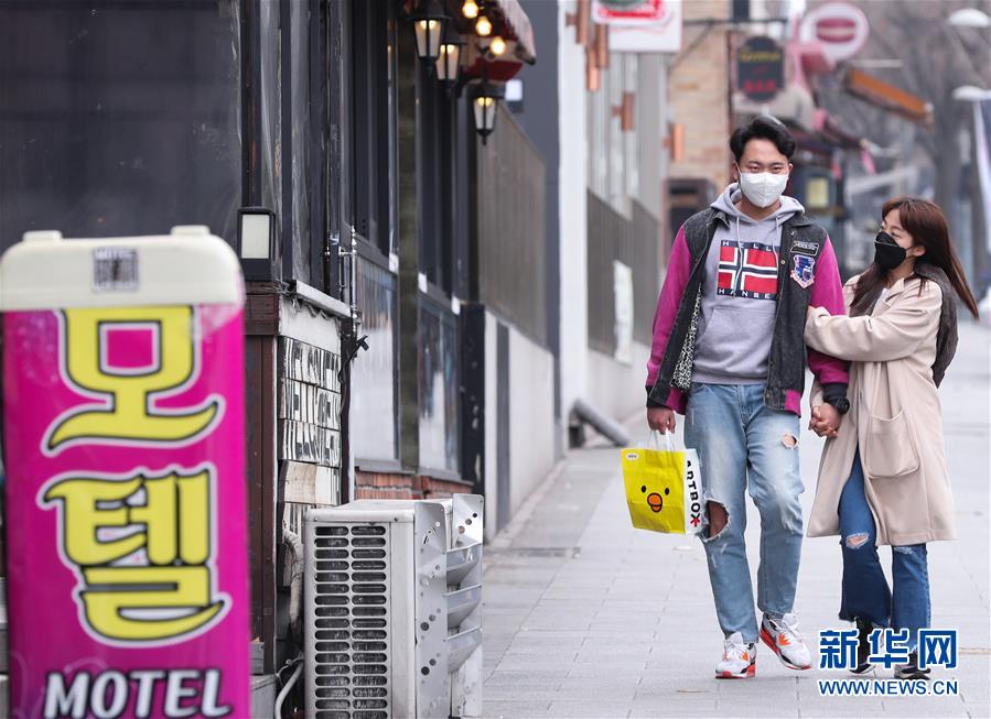 3月1日,在韩国首尔,一对情侣在梨泰院逛街。 韩国疾病管理本部1日发布的最新统计数据显示,截至当地时间16时,韩国较前一日新增586例新冠病毒感染病例,累计确诊病例增至3736例,死亡18例。 新华社记者 王婧嫱 摄
