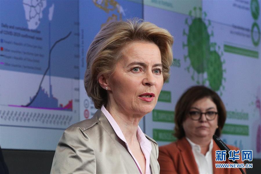 3月2日,在比利时布鲁塞尔,欧盟委员会主席冯德莱恩在有关新冠病毒疫情的新闻发布会上发言。 冯德莱恩表示,新冠病毒持续在欧洲传播,欧洲疾病预防与控制中心已将疫情风险等级从“低度到中度”上调为“中度到高度”。冯德莱恩表示,欧盟当日启动一个新冠病毒应对小组,以协调各方分享信息和防控疫情。