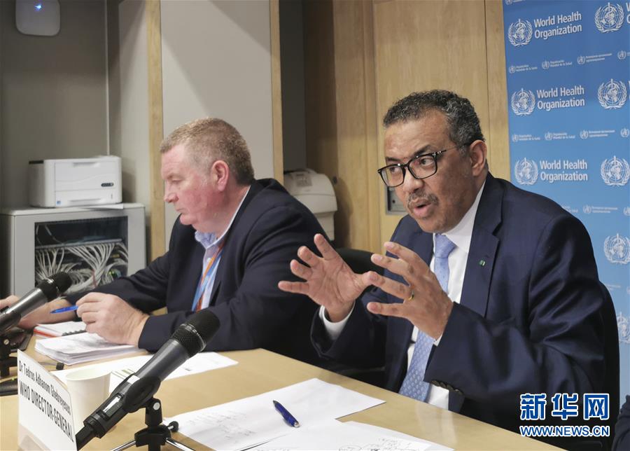 3月2日,在瑞士日内瓦,世界卫生组织总干事谭德塞(右)出席当天的世卫组织例行记者会。世界卫生组织总干事谭德塞2日说,目前在中国以外共有61个国家向世卫组织报告了8739例新冠肺炎病例。其中81%来自韩国、意大利、伊朗和日本,这四国的新冠肺炎疫情已成为该组织非常关注的问题。